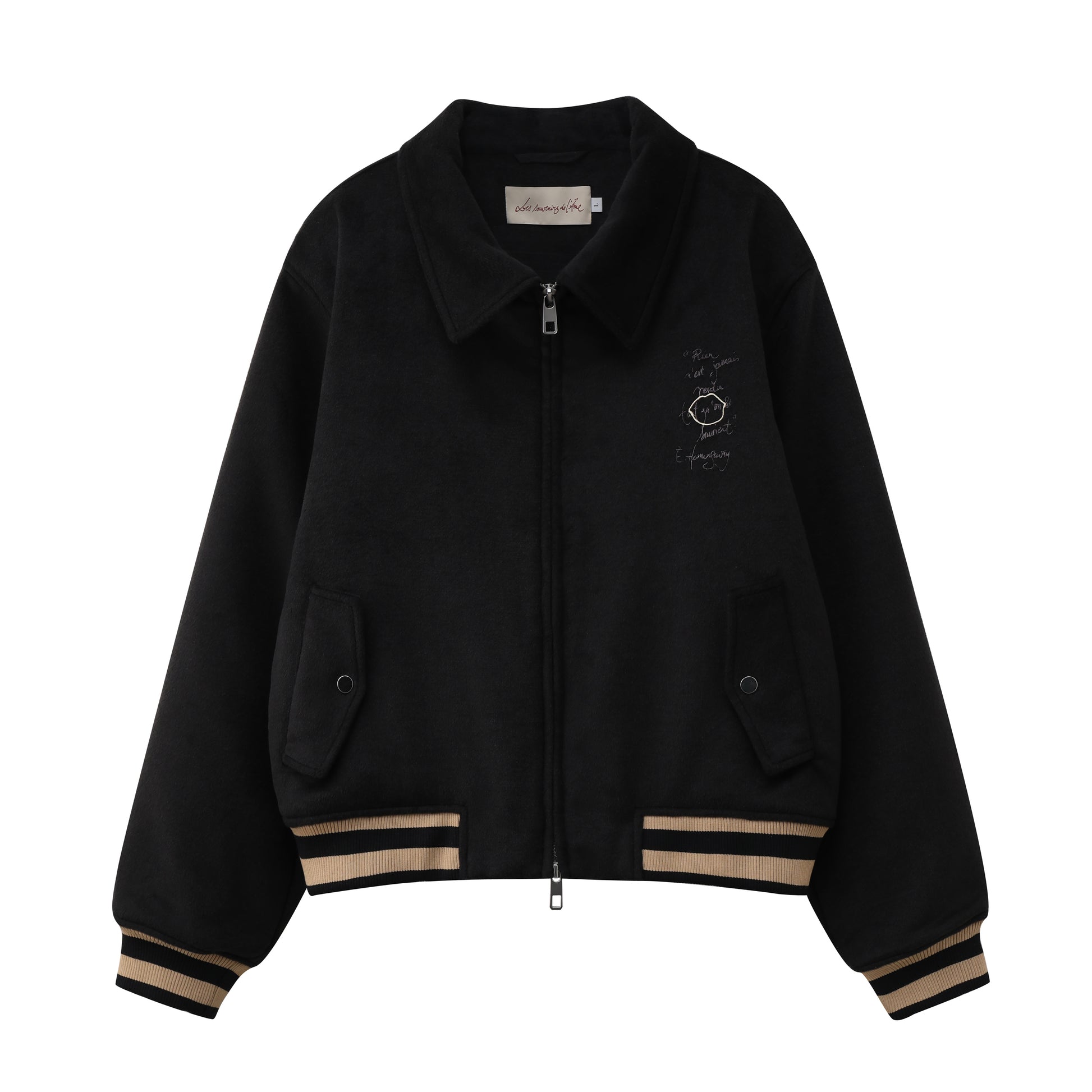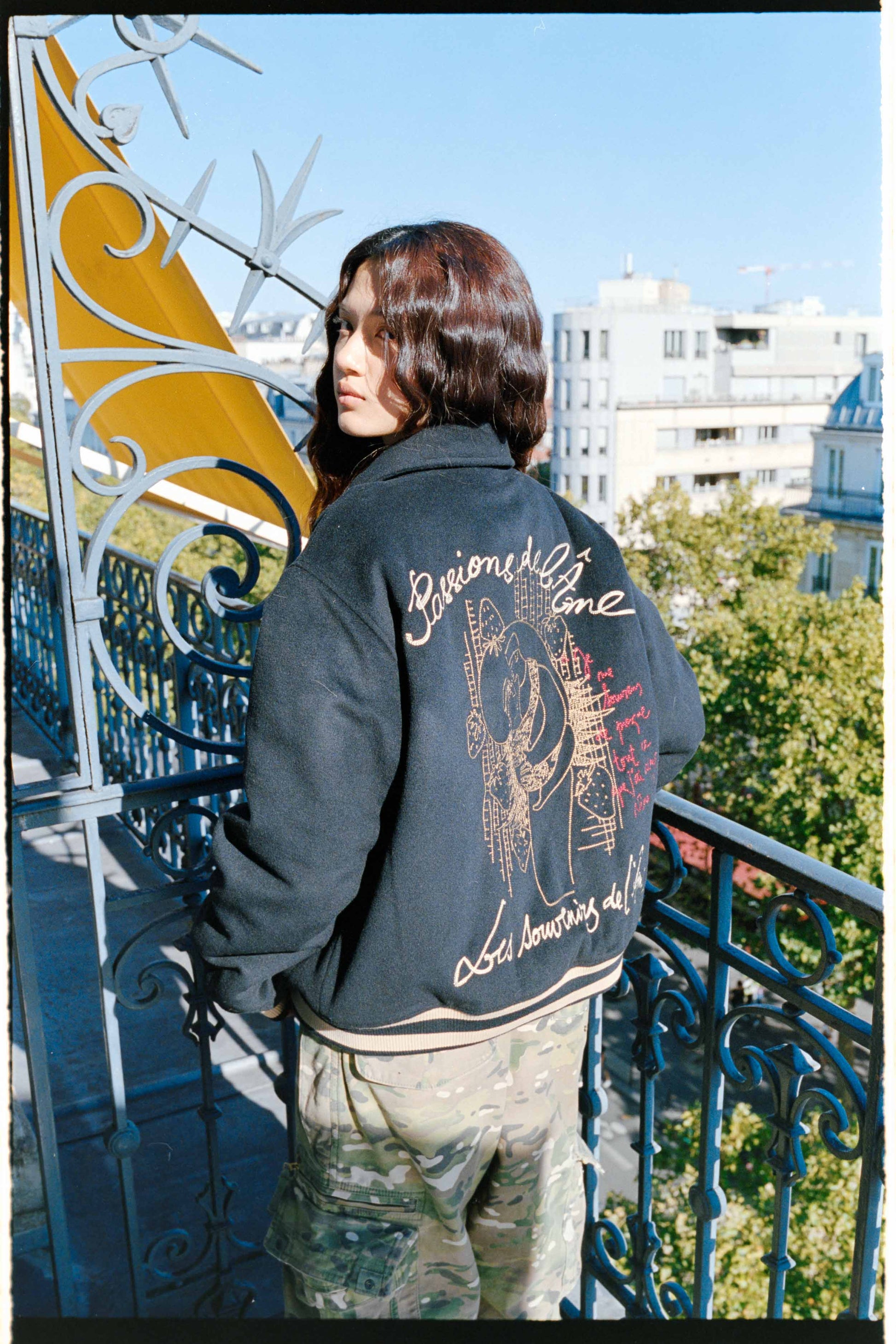 Style varsity revisité avec une approche artisanale, broderie en point de chaîne.